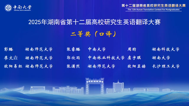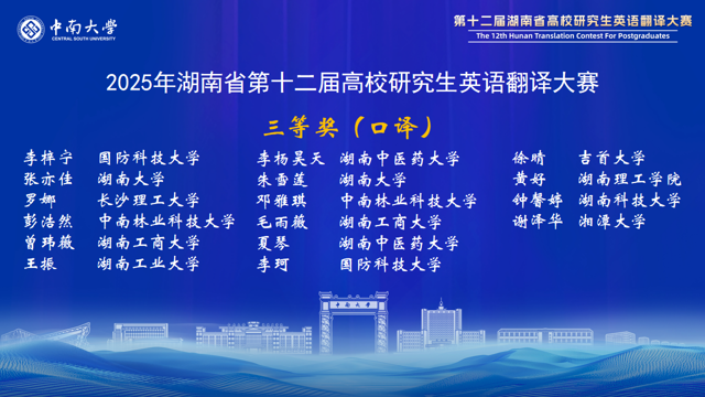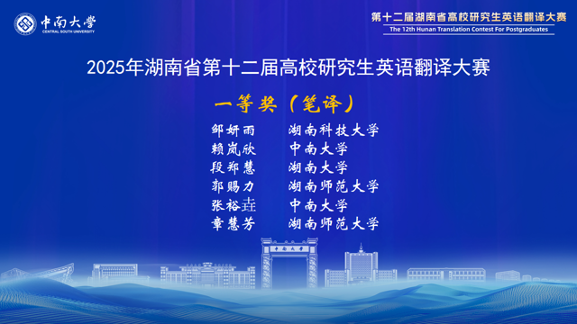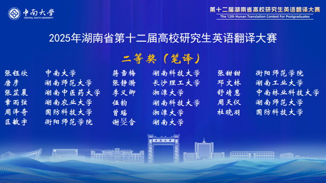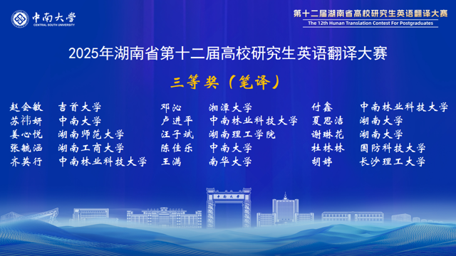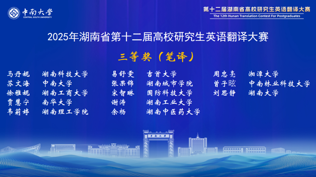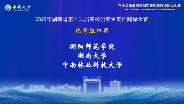 湖南省高校研究生英语翻译大赛在省教育厅的有力指导和精心组织下,已成功举办了12届。赛事对湖南省研究生翻译与国际传播能力的提升起到了巨大推动作用,赛事中涌现出的优秀选手已经活跃在外交外事、国际传播、外贸交流、学术研究等领域。大赛为湖南省研究生搭建了高水平的竞技与交流平台,充分展示了我省研究生外语教育的丰硕成果,为服务湖南“三高四新”战略、加强我国国际传播能力建设发掘了大量青年翻译人才。